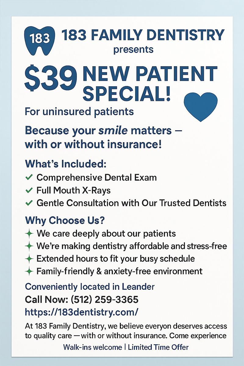 When it comes to your family’s oral health, it’s important to find a skilled and compassionate dentist in Leander who can provide the best options in care. At 183 Family Dentistry we welcome patients of all ages, offering personalized solutions to address a wide range of dental needs.